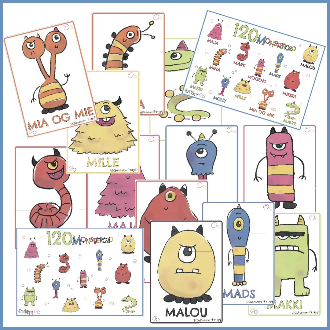 I dette materiale får du plakater til hvert enkelt monster, samt en stor plakat som fx kan bruges som skriverunderlag med alle de 12 monstre på – både uden og med navne.