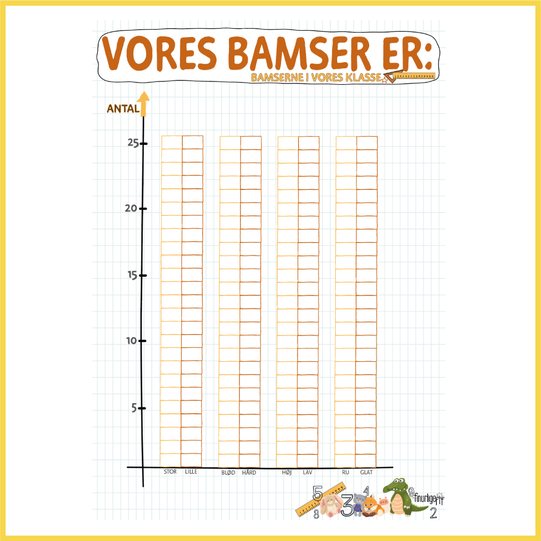 🔸 Arbejdsark: Klassens bamser samles i søjlediagrammer med højde, vægt og egenskaber.