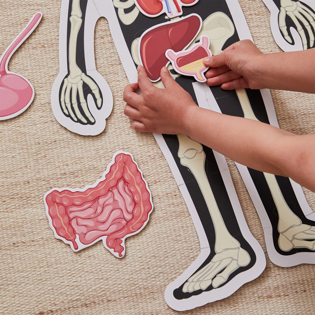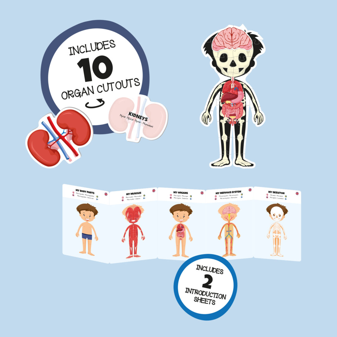 Puslespillet er vendbart: den ene side viser de ydre kropsdele, mens den anden side afslører skeletsystemet. Derudover medfølger 10 realistiske organer, som kan placeres korrekt på kroppen, samt en informativ folder, der forklarer organernes funktioner, musklerne, knoglerne og nervesystemet.