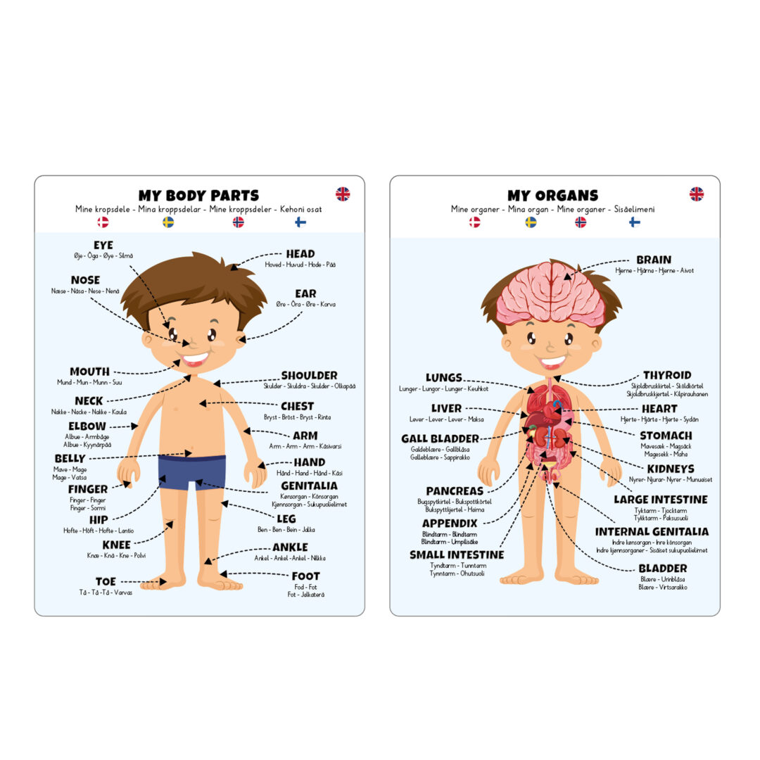 Lærerigt gulvpuslespil med 36 brikker, der illustrerer menneskekroppens ydre og indre dele. Træner anatomisk viden, finmotorik og koncentration gennem leg.