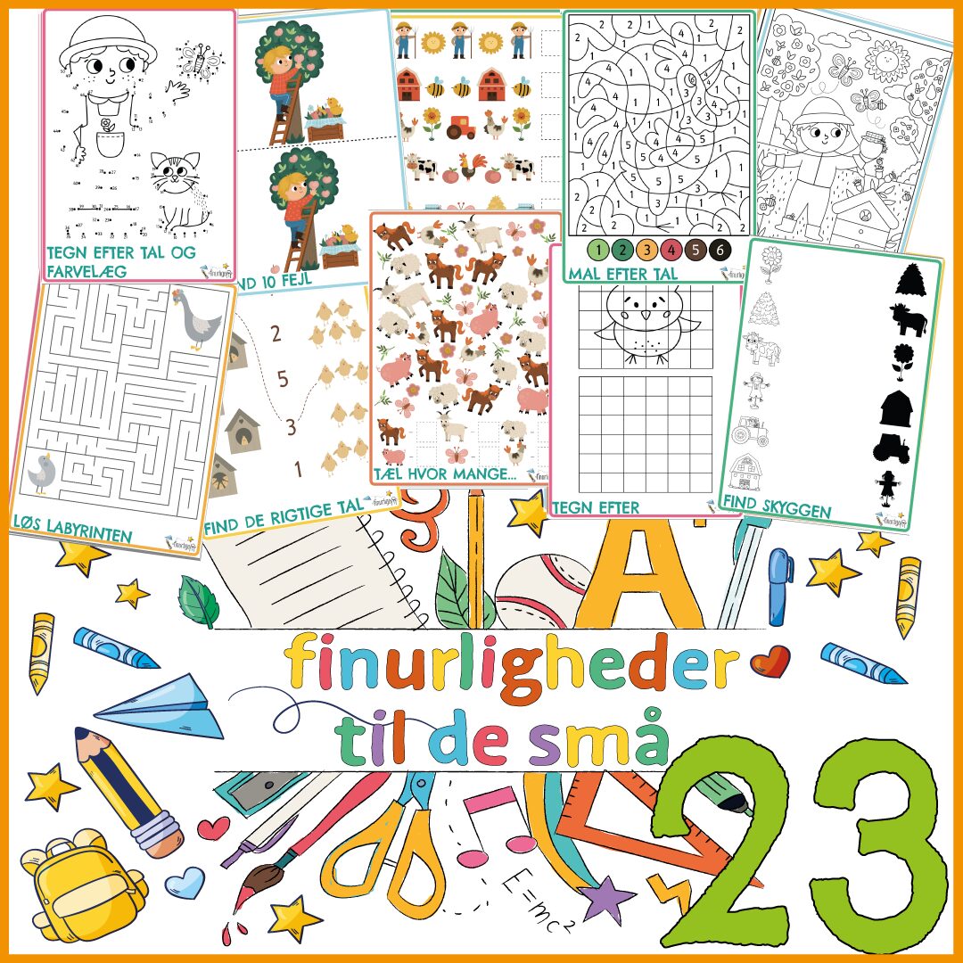 finurligheder til de små er 10 blandede opgaver, hvor I sammen med børn på 3-7 år kan lege, være kreative og hygge med alt fra labyrinter, skygge-match, stregtegning, farvelægning og andet legende læring.