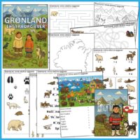 – Ekstra opgaver – Grønland (12 x A4) med ‘forbind dyr med deres fodspor’ ‘Sæt streger mellem ord og korrekt billede’-opgaver, en labyrint, hvor man skal hjælpe en isbjørn gennem for at den kan få mad, tæl, bogstaver, farvlægning og meget mere 🧩