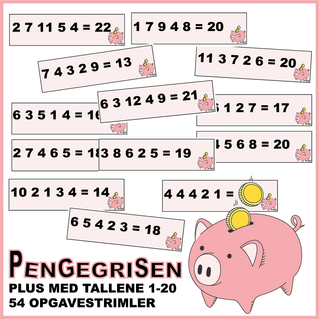 Slip regneglæden løs med Pengegrisen! Her får du 54 opgavestrimler med plusstykker, hvor børnene skal finde de tal, der tilsammen giver en bestemt sum. En legende måde at styrke plusforståelsen og talområdet 1-20 på – perfekt til både værksteder, makkeropgaver og selvstændig træning.