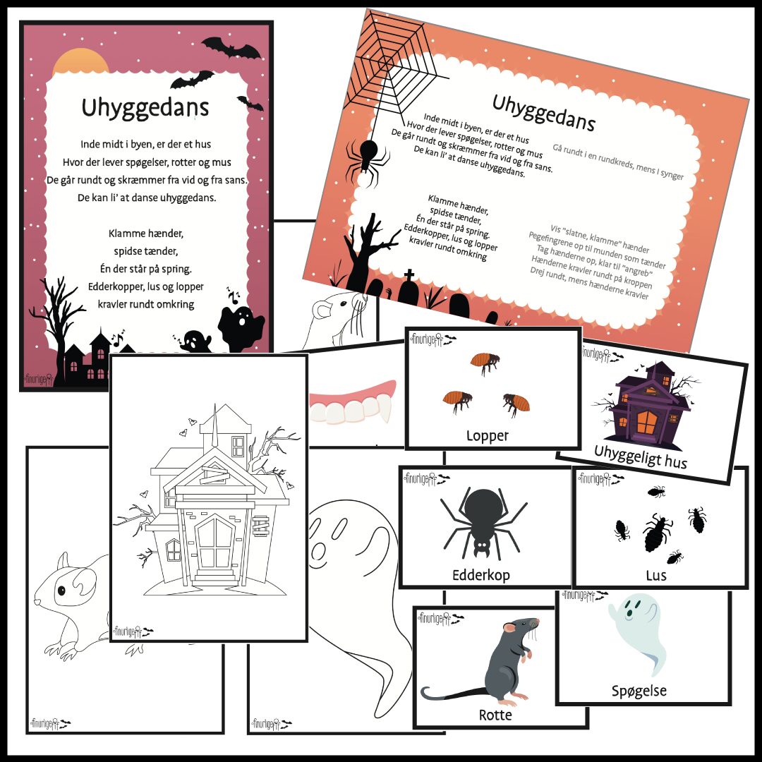 Denne finurlige pakke er en uvurderlig støtte til sangen Uhyggedans og giver en visuel og engagerende tilgang til sangen 🎃🕸️🎶